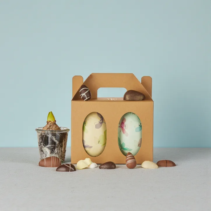 Gavepakke to smukke metal påskeæg med fyldte marcipanæg og fyldte chokoladeæg. En sæsonpræget og gaveklar konfektløsning i samlet format.