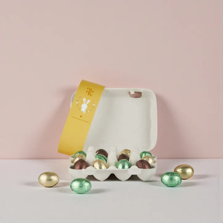 Æggebakke med 96 g mini fyldte chokoladeæg i assorterede varianter. En legende og gaveklar konfektløsning i sæsonpræget indpakning.