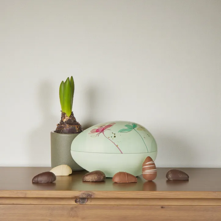Dette smukke, grønne påskeæg med forårsblomster indeholder 10 stk. fyldte chokoladeæg med en samlet vægt på 130 g. Metalægget har et blødt og dekorativt udtryk, der præsenterer indholdet på en indbydende måde.