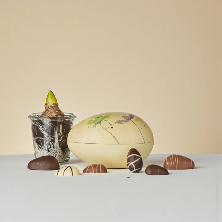 Det flotte metal påskeæg indeholder marcipanæg i et samlet indhold på 255 g. Æsken har et forårspræget og dekorativt udtryk, der præsenterer marcipan og chokoladeæggene på en indbydende måde.