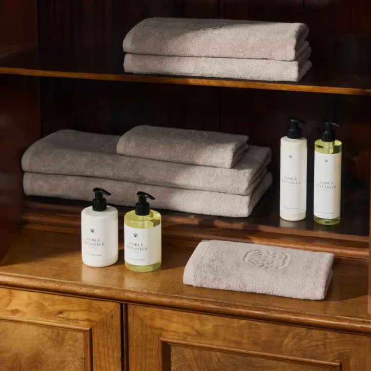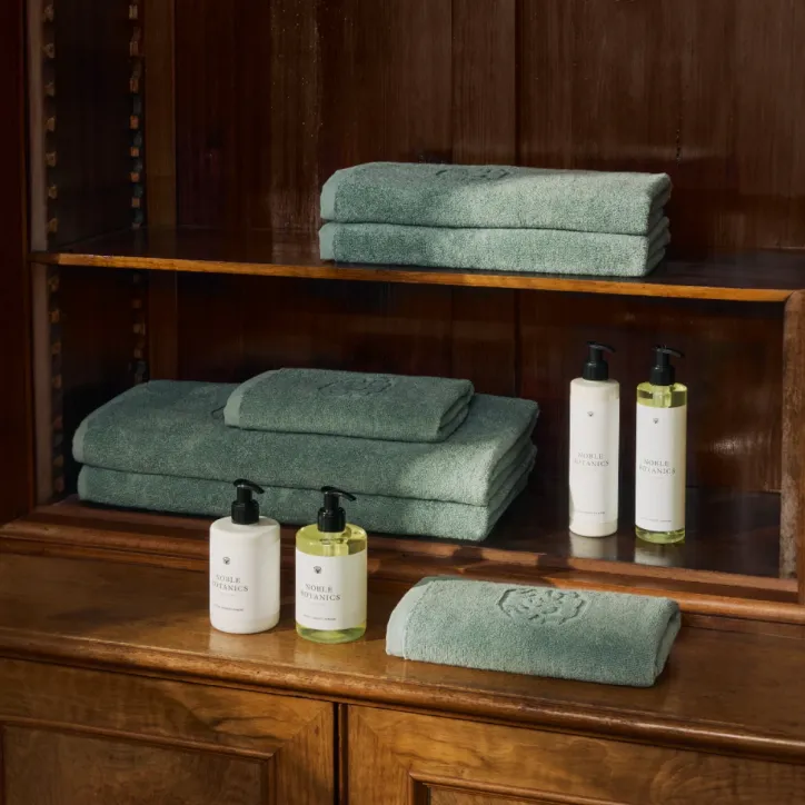Eksklusivt sæt med Damask Terry håndklæder i flere størrelser kombineret med hånd- og kropspleje fra Noble Botanics i et samlet og gennemført udtryk.