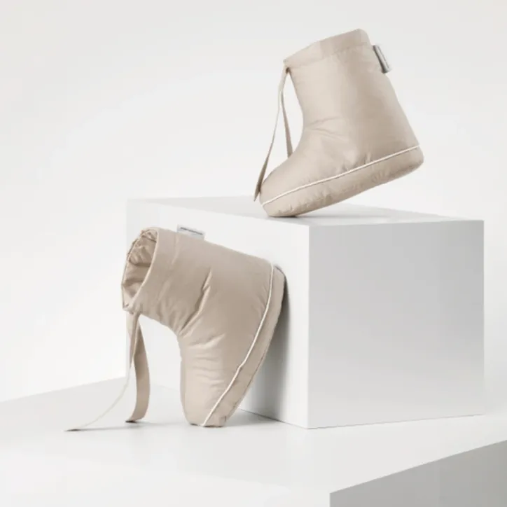 Cloud dunsokkerne fra Georg Jensen Damask er designet til at give en behagelig og lun fornemmelse med et elegant udtryk. Sokkerne er satinvævet i 100 % bomuld og fyldt med GRS-certificerede andedun og -fjer, som sikrer let isolering og blød komfort. Den dekorative piping og bindebåndet ved anklen giver sokkerne et raffineret præg og sikrer samtidig en god pasform. Farven Sand understøtter det rolige og afdæmpede design, der passer naturligt ind i hjemmets afslappede rammer.