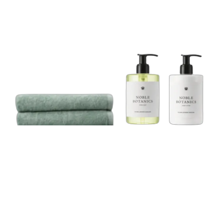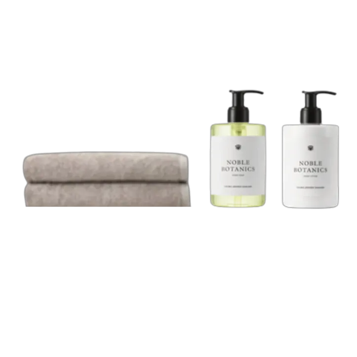 Bundle med Damask Terry gæstehåndklæder i 100 % bomuld samt håndsæbe og håndlotion fra Noble Botanics – fås i Taupe eller Sage Green.