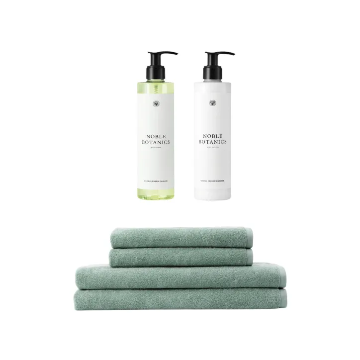 Eksklusivt sæt med Damask Terry håndklæder og badehåndklæder i 100 % bomuld kombineret med plejende kropspleje fra Noble Botanics. Sættet få i enten taupe eller sage green.