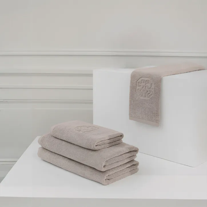 Sæt med håndklæder og badehåndklæder i Damask Terry-kvalitet, udført i 100 % bomuld og tilgængelig i Taupe eller Sage Green.