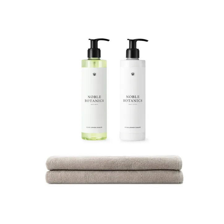 Damask Terry badehåndklæderne fra Georg Jensen Damask er jacquardvævede i 100 % bomuld med løkker af dobbelttvundne og kæmmede garner. Vævningen giver en blød, slidstærk og absorberende kvalitet med et elegant udtryk og indvævet logo, udviklet til daglig brug med høj komfort. Sættet kombinerer badehåndklæderne med Noble Botanics Body Wash og Body Lotion, som er beriget med fugtgivende bomuldsekstrakt. Produkterne er udviklet til skånsom, daglig pleje og bidrager med en behagelig og afbalanceret oplevelse.