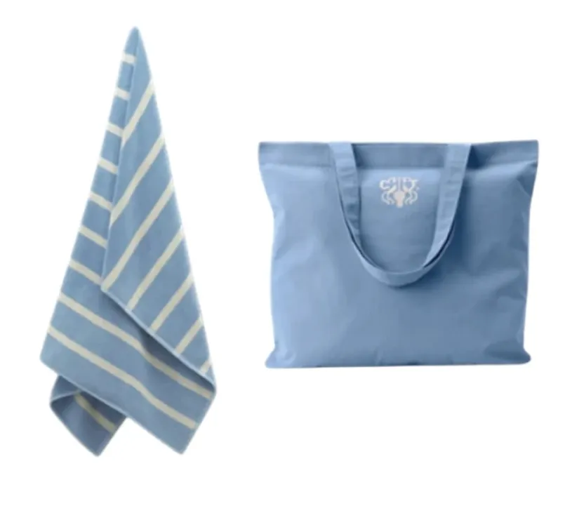 Bundle med SEA badelagen i frotté og matchende tote bag i bomuld – tilgængeligt i Sage Green eller Cerulean.