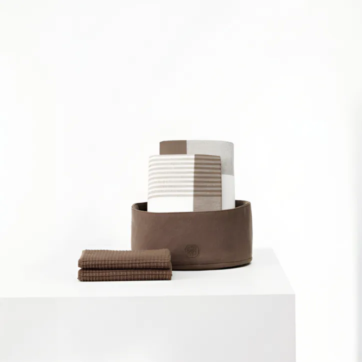 Georg Jensen Damasks køkkentekstiler kombinerer funktion og æstetik i et samlet udtryk. Den originale brødkurv er vævet i 100 % bomuld og afsluttet med et broderet logo, som tilfører en diskret og genkendelig detalje. Becker 63 viskestykkerne er vævet i en blanding af hør og bomuld, der giver gode tørreegenskaber og høj slidstyrke. De medfølgende 3PLY karklude er strukturstrikket i ren bomuld og udviklet til effektiv aftørring i daglig brug.