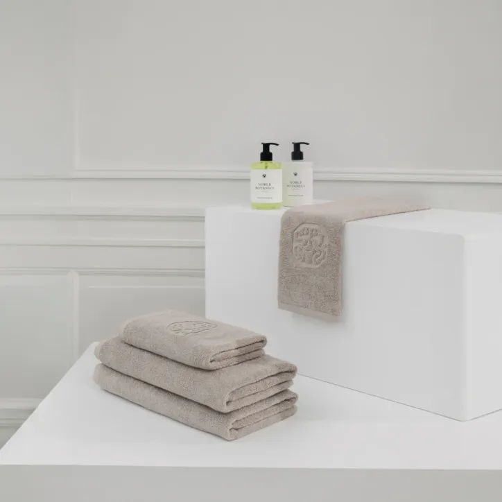 Eksklusivt bundle med Terry håndklæder i 100 % bomuld og velduftende håndsæbe fra Noble Botanics. Håndklæderne er tilgængeligt i Taupe eller Sage Green.