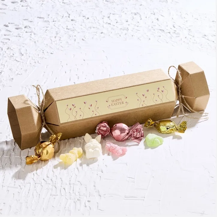 Lille knallertæske med 160 g påskemix bestående af chokoladeæg, guldkarameller, påskevingummier og skumharer. En klassisk påskegave i naturlook.