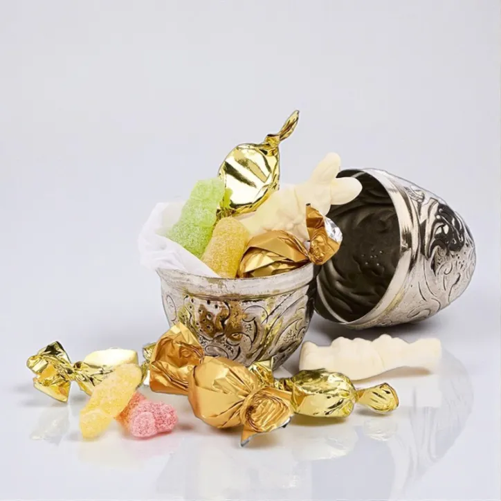 Eksklusivt sølvæg med 100 g påskemix bestående af chokoladeæg, guldkarameller, påskevingummier og skumharer. En dekorativ gave med fokus på både smag og design.