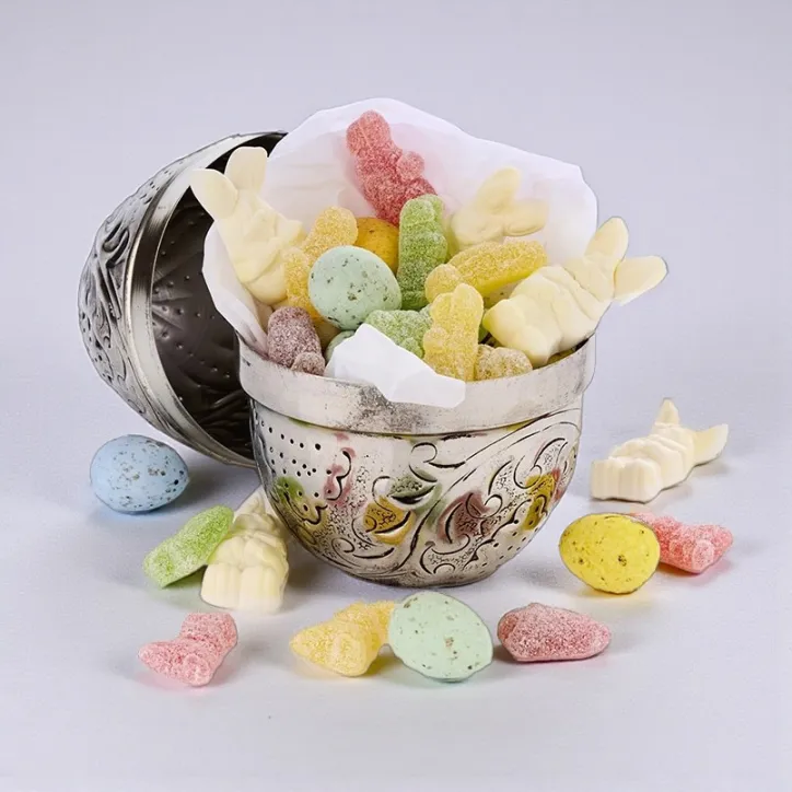 Dette eksklusive sølvæg forener påskens søde fristelser med et elegant og tidløst design. Indeni gemmer sig en lækker blanding af sprøde nougat fugleæg, syrlige påskevingummier og fine skumharer, som tilsammen skaber variation i både smag, tekstur og farver.