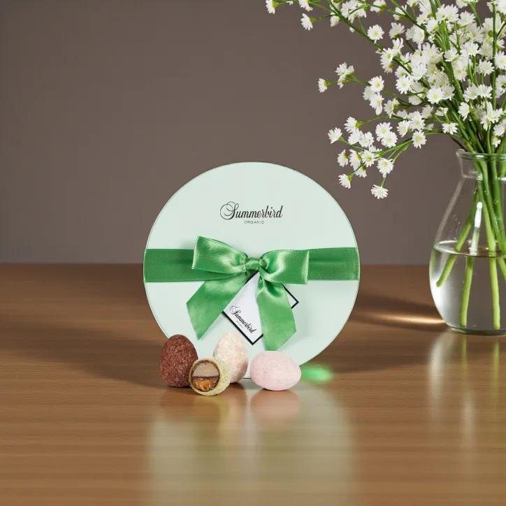 Den runde æske præsenterer indholdet på elegant vis og samler flere smagsudtryk i én påskegave. En gennemført og eksklusiv konfektløsning til påsken.