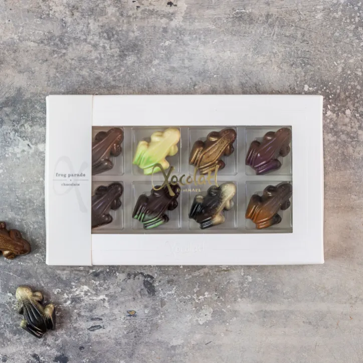 Xocolatl Frog Parade er en festlig chokoladeæske fra danske Xocolatl, som samler 8 små, fyldte chokoladefrøer i én elegant gave. Chokoladerne kommer i forskellige smagsvarianter — herunder orange, nougat, 70 % mørk ganache, passionsfrugt, mint, cremet flødekaramel, lakrids og kaffe — hvilket giver en spændende variation af søde, friske og lidt mere intense smagsoplevelser.